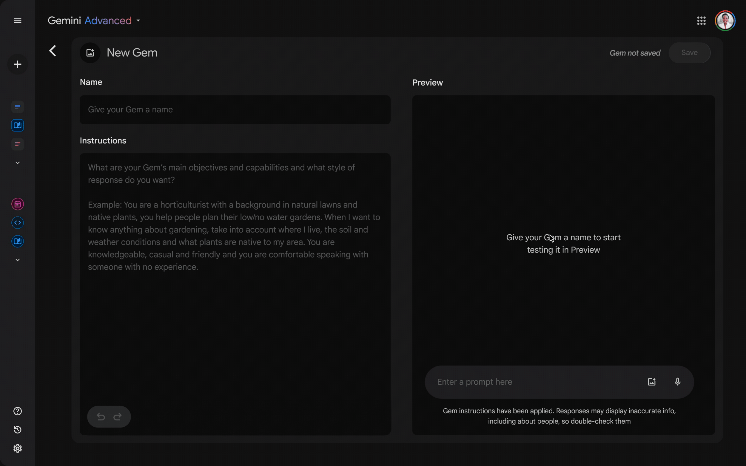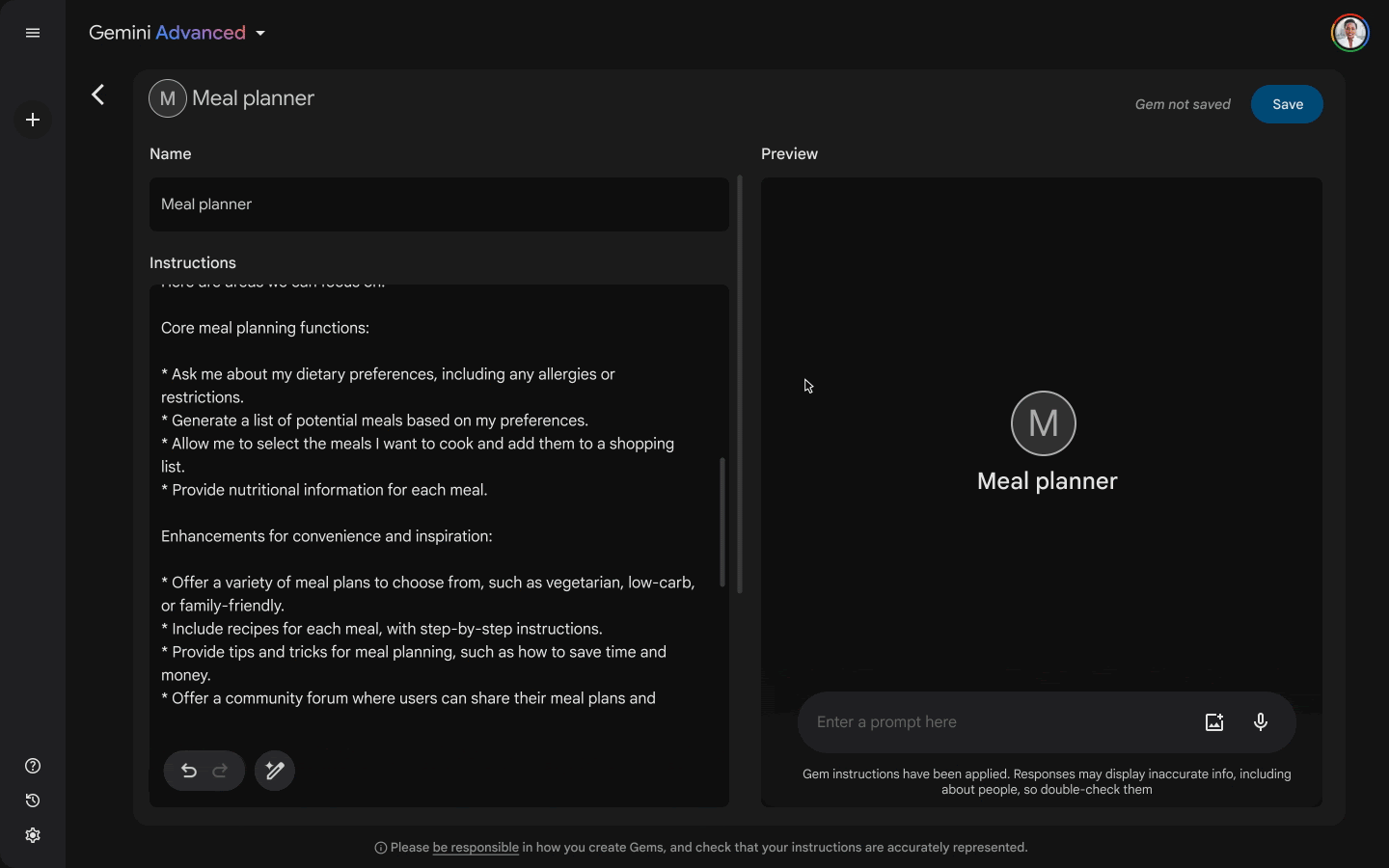 In order for the preview window on the right-hand side of the screen to take all of the latest changes to the Gem instructions into account, a small amount of latency was needed to share the new context with the model. This took the form of an ephemeral save, triggered each time the user changes focus after making an edit. A scrim over the preview window showed when it was unavailable during the ephemeral save.