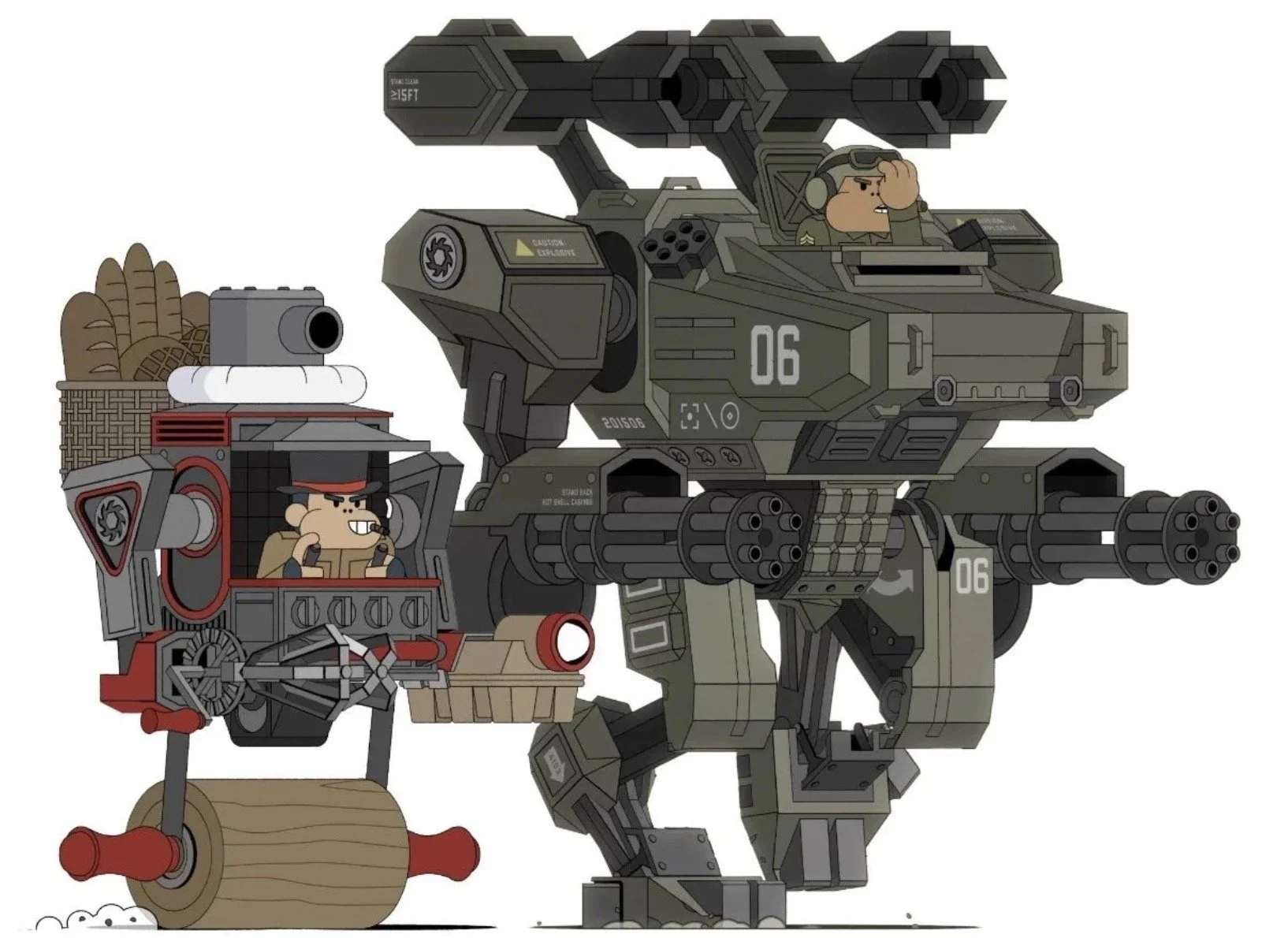 We decided the idea might be just dumb enough to work, and set about creating an extensive library of modular, animated components to be used for the assembly of the mechs and their simian pilots.